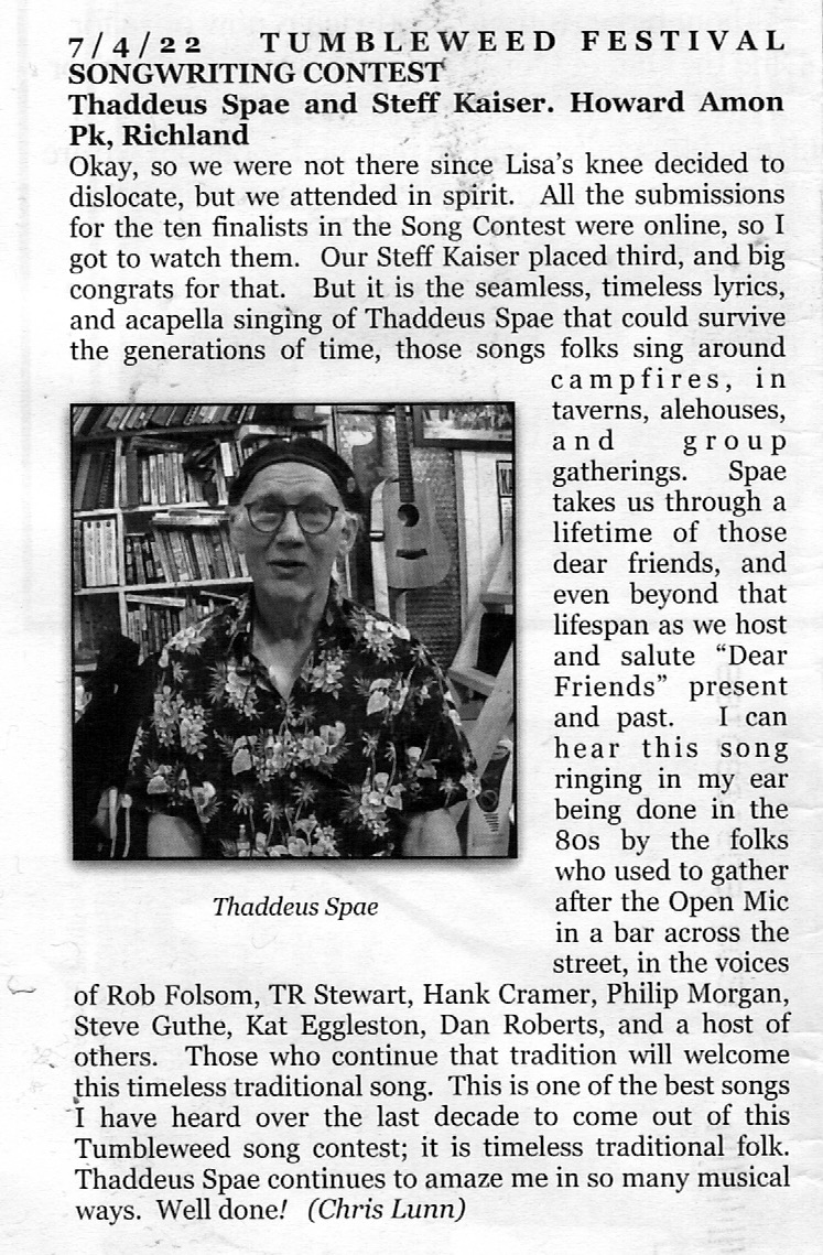 News6/5/25: Back In The Show. I'm a finalist in the Jane Titland Memorial Songwriting Contest at Tumbleweed Folk Festival with my song "Fifteen", a bit of sidewalk rock from my feckless youth about love, modern day minstralry and the life of the road. Now I just have to buff up enough to be able to play it again... UPDATE: No joy...except the thrill of participation. 5/1/24: RIP The Bard's Cathedral Online Store. As of since it deprecated itself out of functionality last month, the BCOS is henceforth closed for biz. All my good and glorious merch is now available via my Bandcamp store (https://tspae.bandcamp.com). 1/18/24: On the air Got a little exposure (brrrr) on KING 5 News playing in the Westlake bus tunnel. Thanks, Metro! 7/15/22: Still on it... Once again I'm a finalist in the Jane Titland Memorial (IRL!) Songwriting Contest at Tumbleweed Folk Festival with my song Dear Friends. I'm a playah! UPDATE: Out of the money again, but Chris Lunn of Ancient Victorys gave me the review I always wished for, so there's that. 7/7/21: Once more unto the breach... Tumbleweed Folk Festival has invited me and my song "Look For The Silver Lining" to compete as a finalist in the Jane Titland Memorial (virtual) Songwriting Contest. Root for me! UPDATE: Sadly, I didn't win, place or show. Gladly, it's an honor just to be a finalist... 9/20/2020: And then..A revision, improvement and replacement of previous merch, Old Dogs, lotsa keen new tunes from the Old Dog himself. Uh, me, that would be. Geezers, codgers, gummies, puppers, pooches and hounds. Splendid! Downloads and actual CDs on bandcamp.com. Arf! |